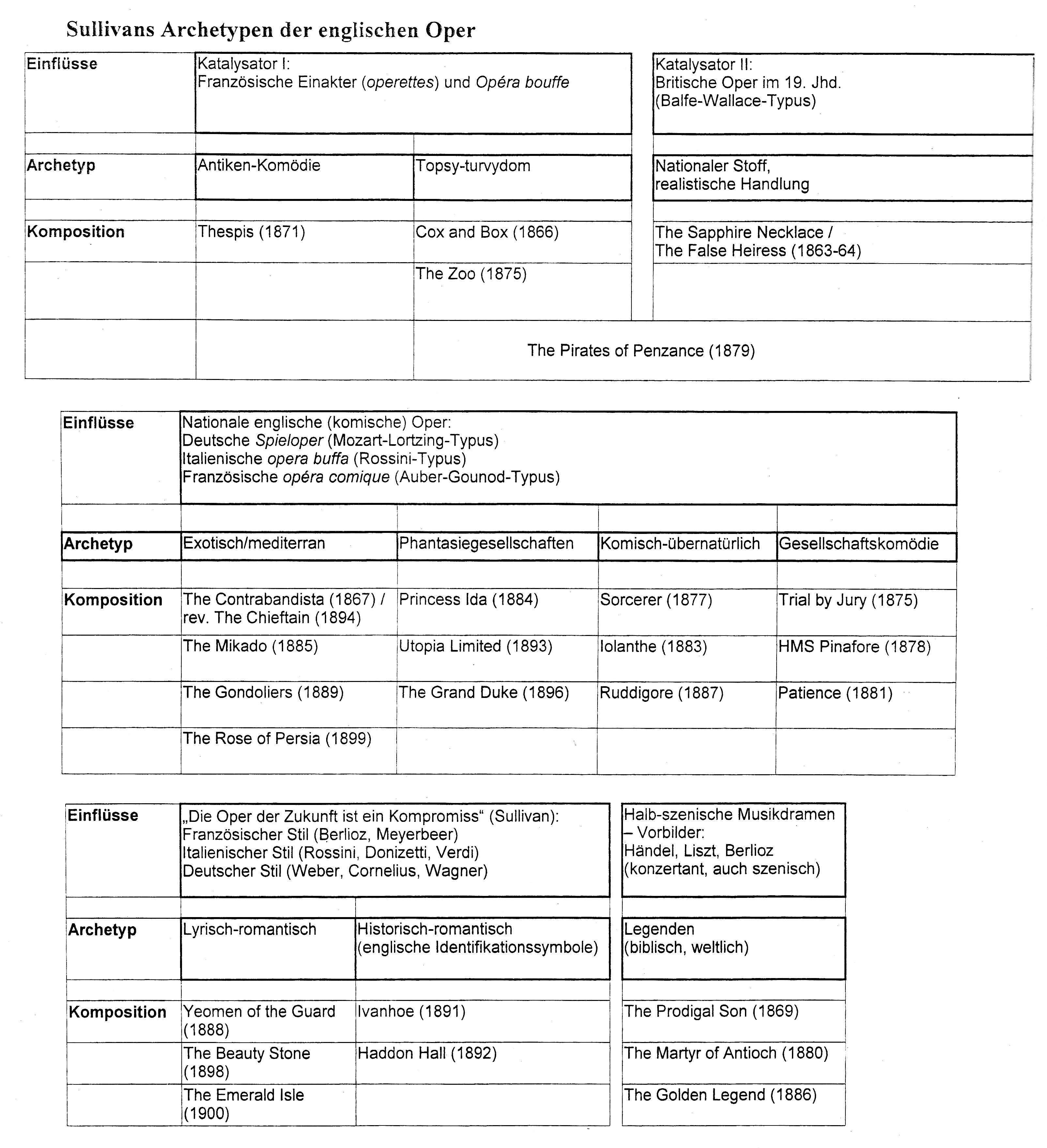 In der Zusammenarbeit mit dem Theatermanager Richard D'Oyly Carte schuf Sullivan zwischen 1875 und 1900 ein breites Spektrum an Werken für die Oper in englischer Sprache. Er prägte damit die unterschiedlichen Archetypen des englischen Musiktheaters in einer Epoche, in der andere britische Komponisten – sofern sie sich überhaupt damit befassten – noch Opern auf italienische Libretti schrieben oder ihre Bühnenkompositionen an deutschen Theatern uraufführen ließen (In einem deutschen Opernführer, der noch im ersten Drittel des 20. Jahrhunderts in mehreren Auflagen erschien, wird Arthur Sullivan als „der namhafteste englische Musiker der Gegenwart“ und als „Urheber der englischen Nationaloper“ bezeichnet 1). Sullivans wichtigster Librettist William Schwenck Gilbert lieferte in erster Linie Texte zu komischen Opern mit einigen aktuellen satirischen Bezügen. Der Komponist kleidete durch seine differenzierte musikalische Ausgestaltung und Instrumentierung jede einzelne Nummer und Szene in ein charakteristisches Klanggewand (1889 verwendet er in einem Brief sogar die Formulierung “clothed with music by me”). Für die Bühne schuf Sullivan mustergültige Werke im Bereich der phantastisch-komischen Oper (Iolanthe 1882, Ruddigore 1886), der Gesellschaftskomödie (Trial by Jury 1875, Patience 1881) und der lyrisch-romantischen Oper (The Yeomen of the Guard 1888, The Beauty Stone 1898 mit Textbuch von Arthur W. Pinero). Der seinerzeit beliebte Exotismus wurde bedient in The Mikado (1885 eine weitere Zusammenarbeit mit Gilbert) und The Rose of Persia (1899 mit Basil Hoods Textbuch).
